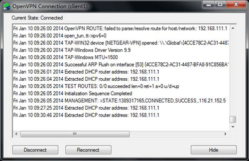 ①通过OpenVPN软件查看:鼠标悬停在通知区域的OpenVPN图标上可看到下图中的信息: